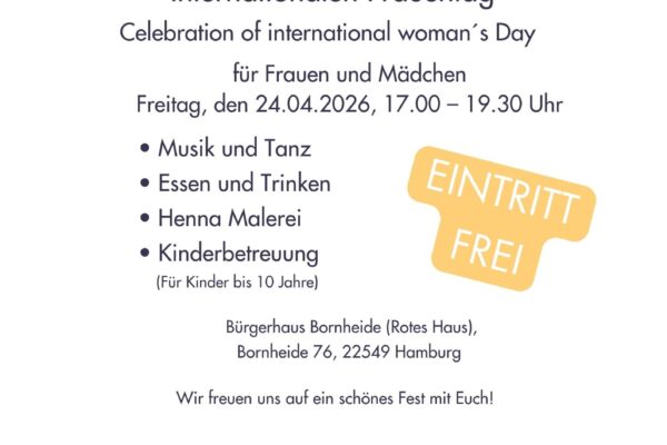 Für Frauen und Mädchen. Programm:1.) Musik und Tanz2.) Essen und Trinken 3.) Henna MalereiKinderbetreuung für Kinder bis 10 Jahre!
