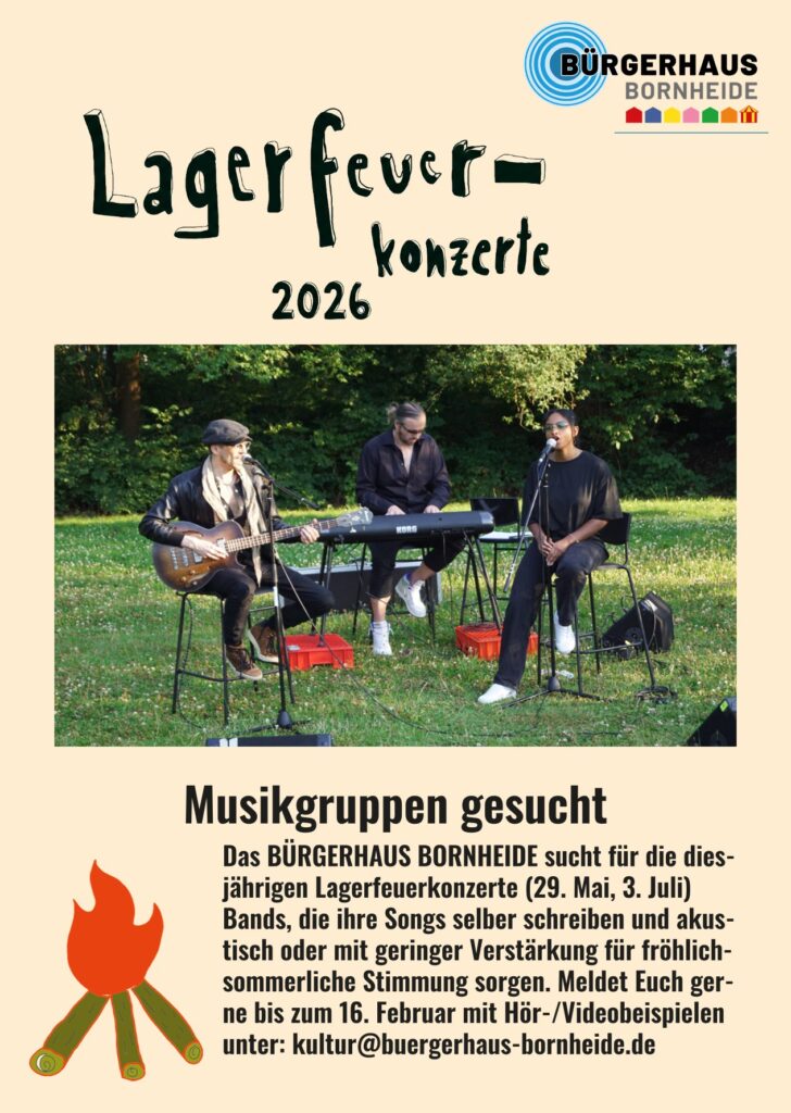 Bürgerhaus im Bürgerhaus Bornheide2026 finden die Lagerfeuerkonzerte an folgenden Terminen statt: 29. Mai, 3. Juli. Das Bürgerhaus Bornheide sucht ab sofort Bands, die akustisch oder mit wenig Verstärkung an einem der 2 möglichen Termine für fröhliche, sommerliche Lagerfeuerstimmung zu sorgen. Von Pop, Rock, Latin über Hip Hop, Country und Singer/Songwriter bis hin zu Jazz, Bossanova und Weltmusik ist alles möglich! Wir freuen uns auf zahlreiche Bewerbungen mit Hörbeispielen an. Bewerbungen bitte an kultur@buergerhaus-bornheide.de bis 16. Februar.