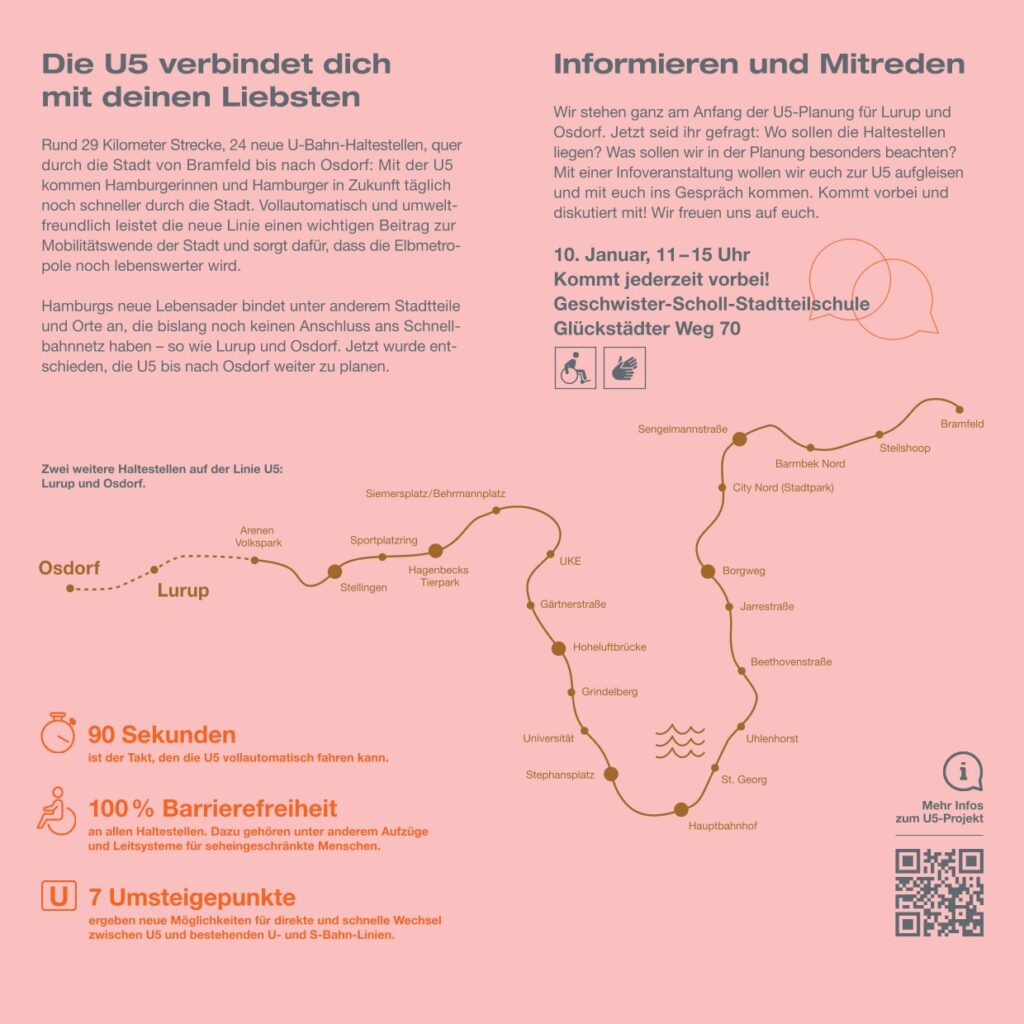 Wir stehen ganz am Anfang der U5-Planung für Lurup und Osdorf. Jetzt seid ihr gefragt: Wo sollen die Haltestellen liegen? Was sollen wir in der Planung besonders beachten? Mit einer Infoveranstaltung wollen wir euch zur U5 aufgleisen und mit euch ins Gespräch kommen. Kommt vorbei und
