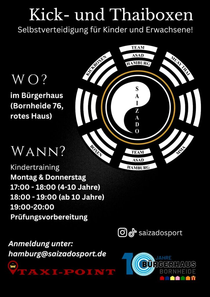 Saizado Sport in Kooperation mit TP Funk Service Taxi.Point.Kick- und Thaiboxen für Kinder ab 4 Jahren bis Jugendliche bis 16 Jahren. Das Ziel von SaizadoSport ist es, Kinder in ihrem Selbstbewusstsein zu stärken, ihnen Selbstverteidigung und Notwehr beizubringen und besonders Opfer von Mobbing und Gewalt in ihrer inneren Stärke, Disziplin und Motivation zu fördern.